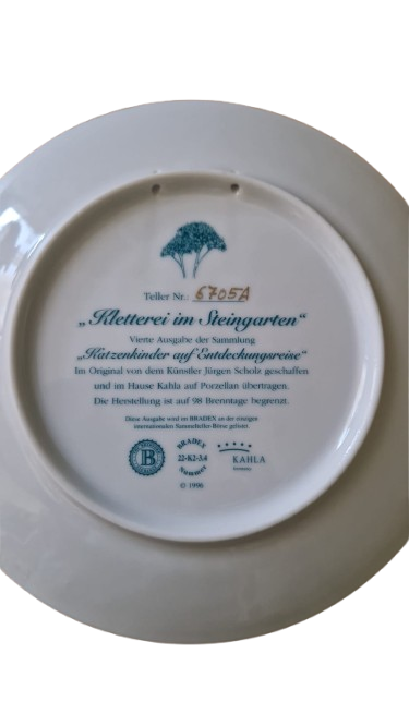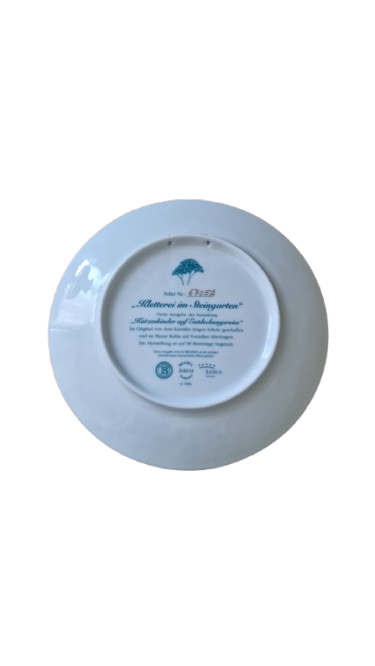 Sběratelský porcelánový talíř s názvem "Kletterei im Steingarten" (Šplhání v kamenné zahradě).