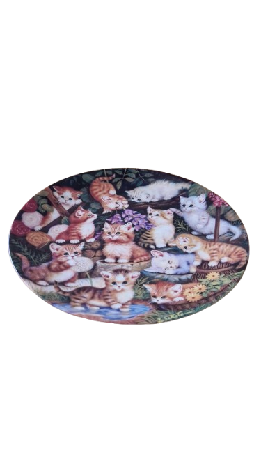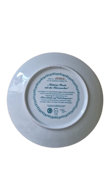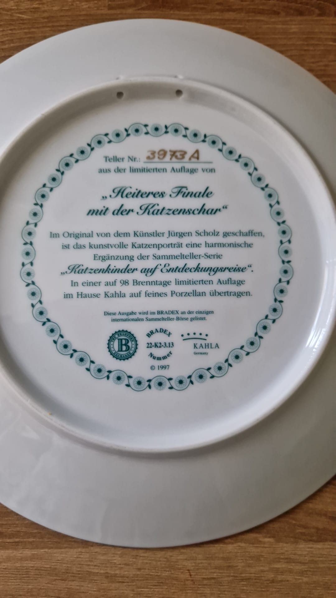 Sběratelský porcelánový talíř s názvem "Heiteres Finale mit der Katzenschar" (Veselé finále s kočičí partou). Je součástí limitované edice a série sběratelských talířů "Katzekinder auf Entdeckengreise" (Koťata na průzkumné cestě).