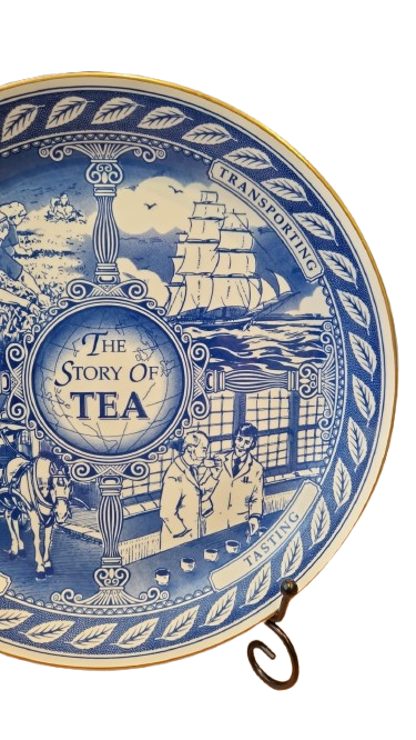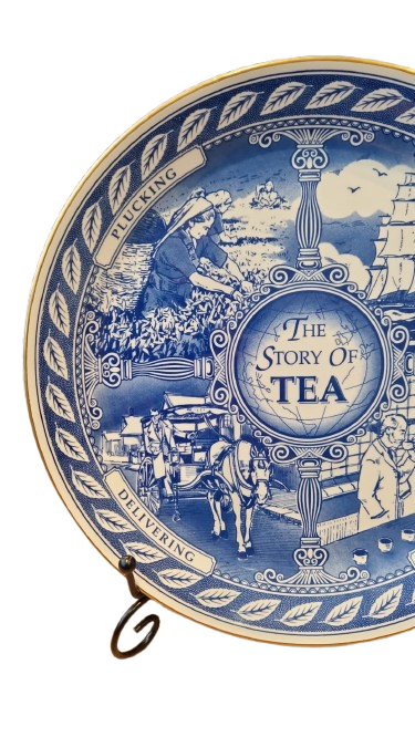 Talíř nese název "The Story of Tea" (Příběh čaje) a je zdoben nádherným modrobílým dekorem (transferware) s jemným zlaceným okrajem. Centrální motiv je rozdělen do čtyř detailních výjevů, které mapují cestu čaje od sběru na plantážích až po finální degustaci.