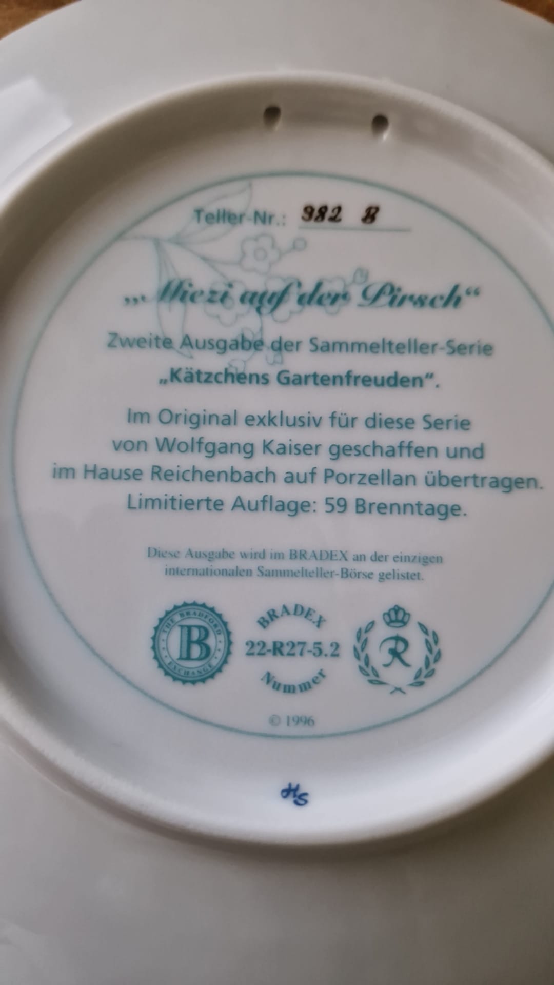 Sběratelský porcelánový talíř s certifikátem z limitované edice s názvem "Miezi auf der Pirsch" (Miezi na lovu). Jedná se o druhou edici ze série "Kätzchens Gartenfreuden" (Kočičí radosti v zahradě).