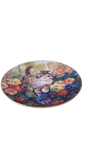 Sběratelský porcelánový talíř s certifikátem z limitované edice s názvem "Kitty auf leisen Sohlen" (Kočka na tichých tlapkách). Jedná se o páté vydání ze série "Kätzchens Gartenfreuden" (Kočičí radosti v zahradě).