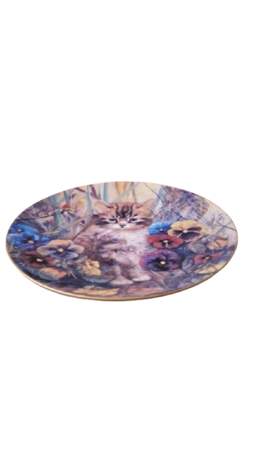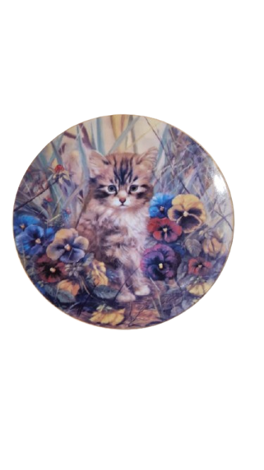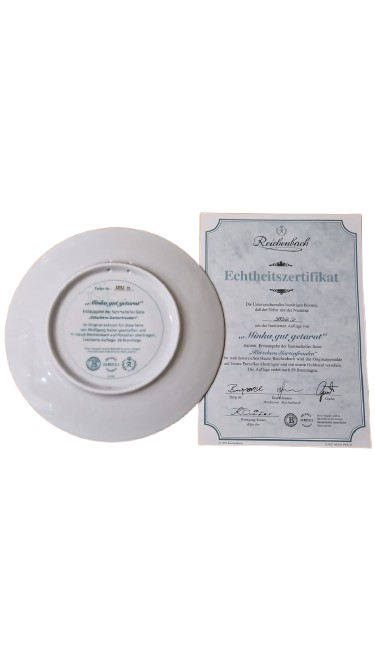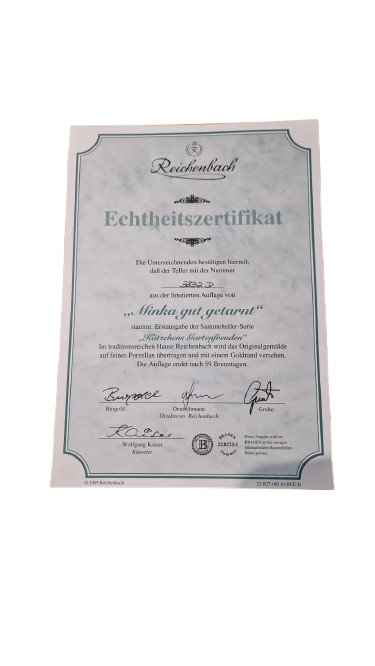 Sběratelský porcelánový talíř s certifikátem z limitované edice s názvem "Minka gut getarnt" (Minka dobře maskovaná). Jedná se o první vydání ze série "Kätzchens Gartenfreuden" (Kočičí radosti v zahradě).