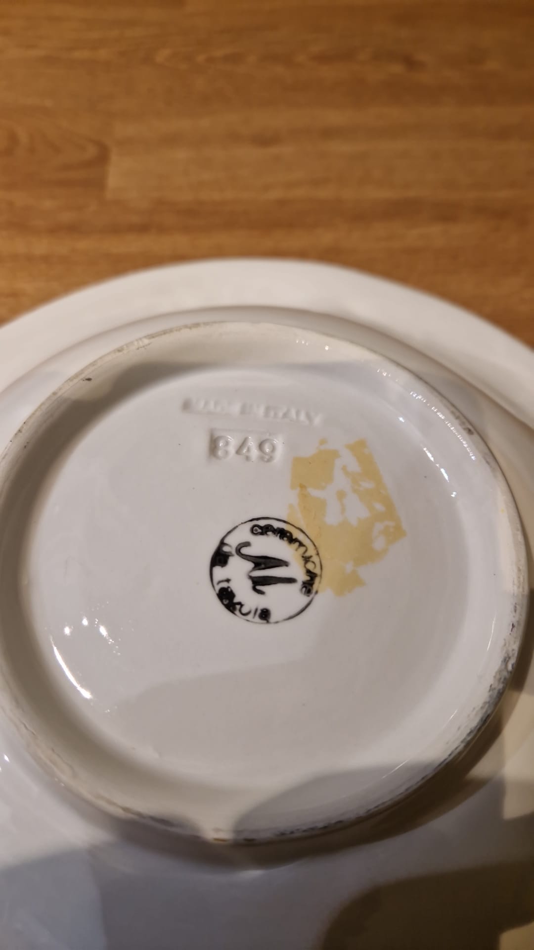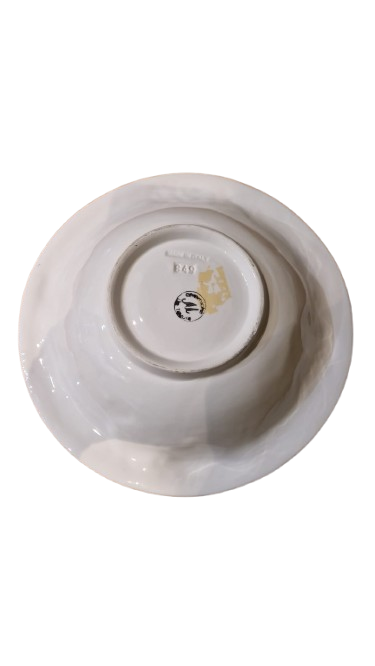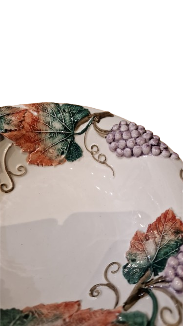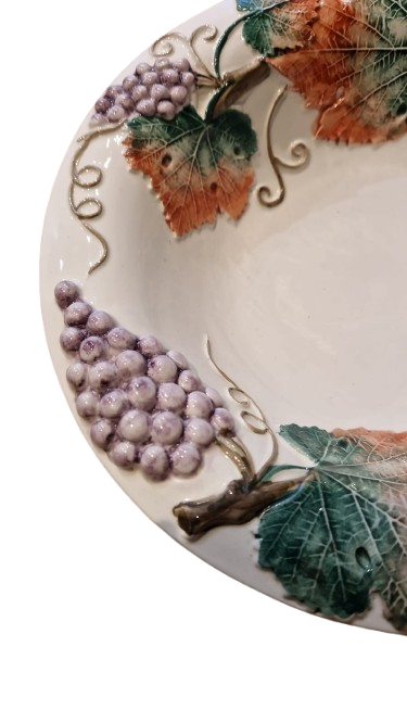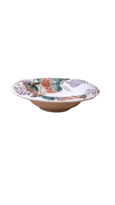 Keramická mísa z bílé glazované keramiky zdobená 3D motivy hroznů a vinných listů. Dekorace jsou plastické, s fialovými hrozny a listy v zelených a podzimních odstínech.