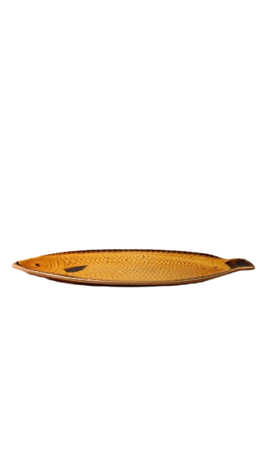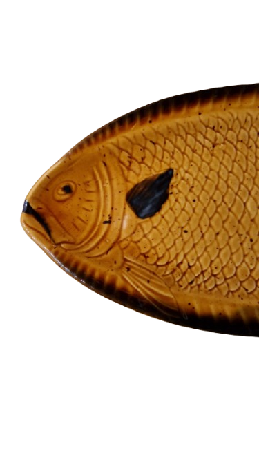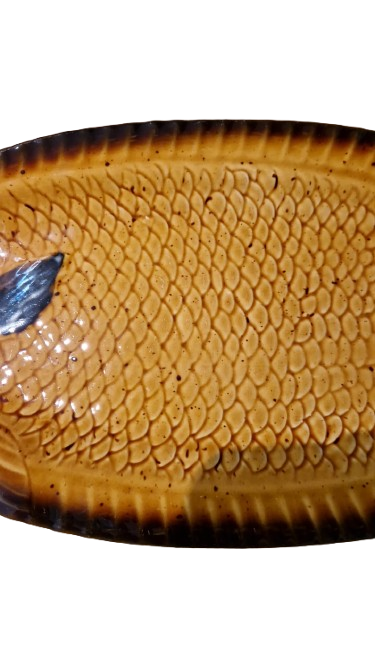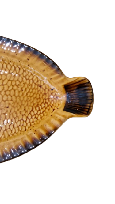 Je navržen ve tvaru platýse s karamelovou glazurou a tmavě hnědými detaily. Šupiny a žábry jsou reliéfní.