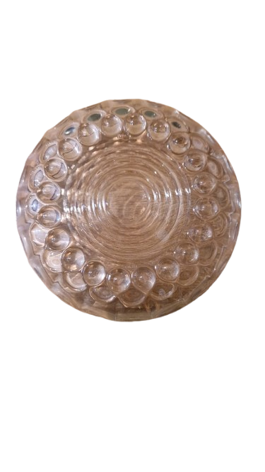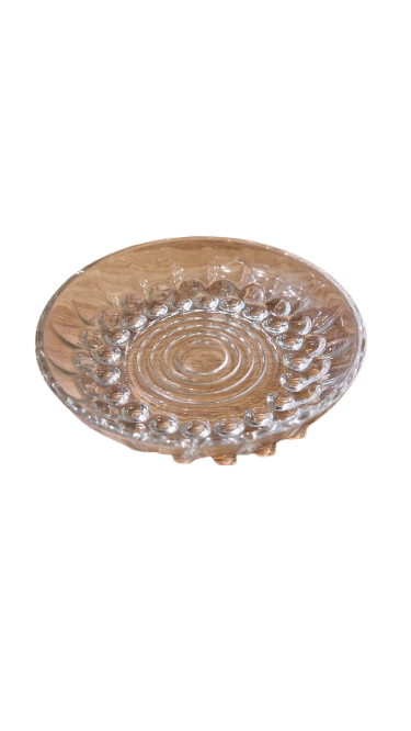 Skleněná miska z lisovaného skla s bublinkovým vzorem a koncentrickými kruhy, vyrobena ve Francii.