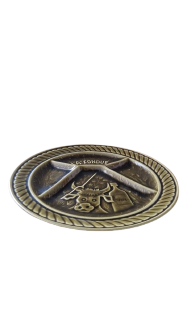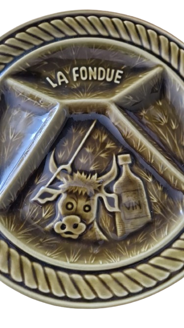 Uprostřed je reliéfní kráva a láhev s nápisem "Vin" (francouzsky víno), což je běžná přísada nebo doprovod k fondue.