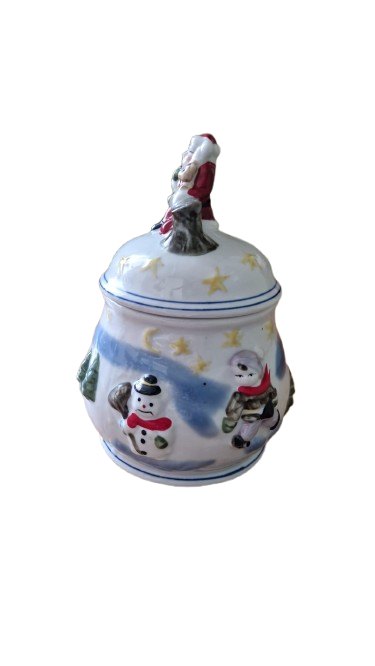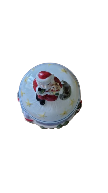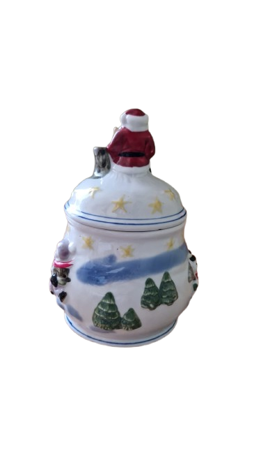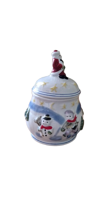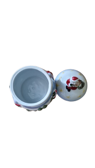 Keramická dóza na cukroví s vánočním motivem.