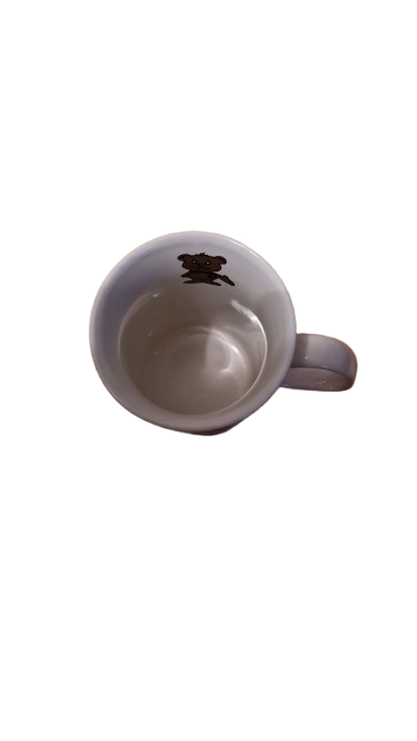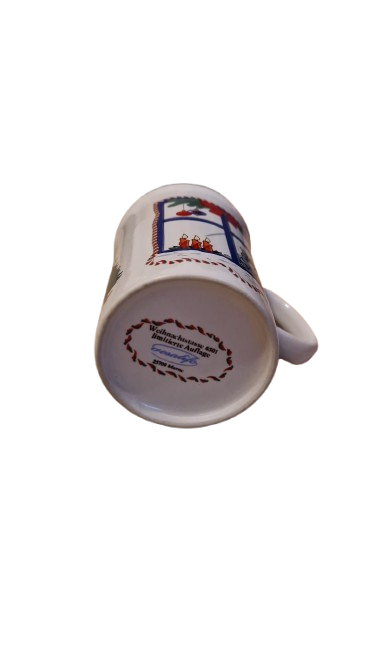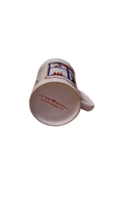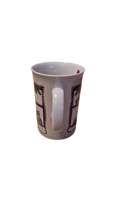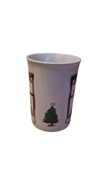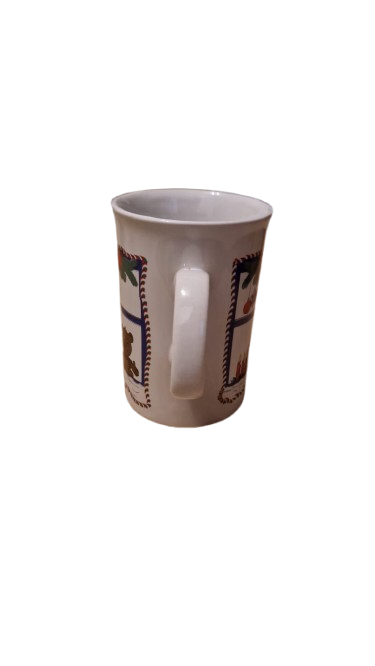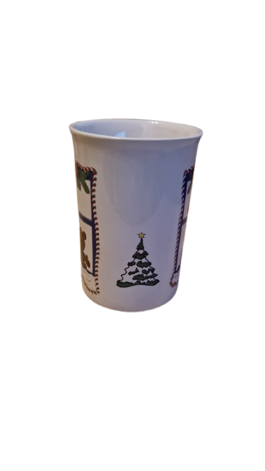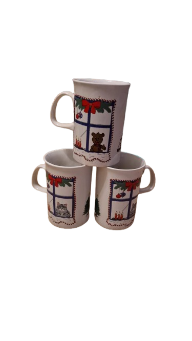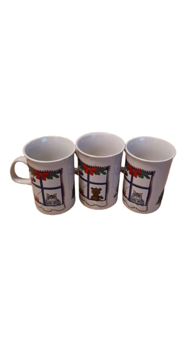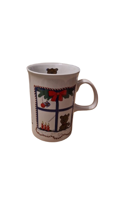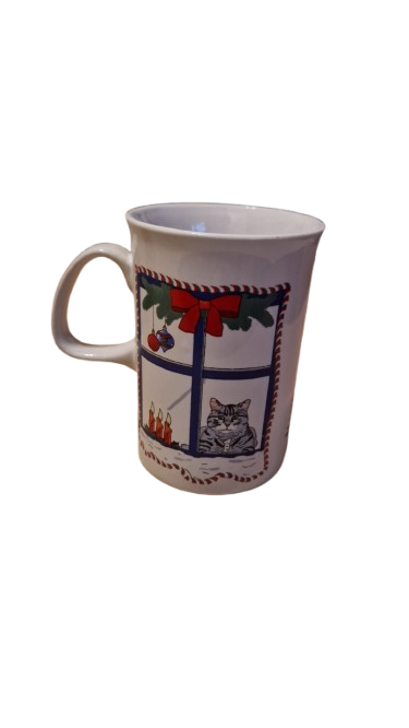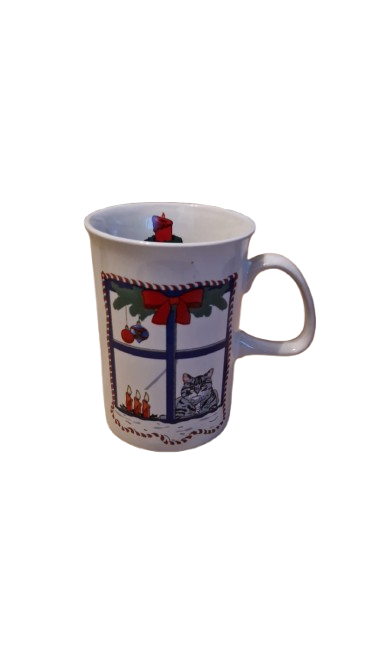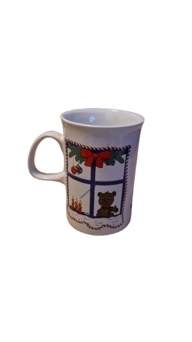 Keramický hrníček s vánočním motivem medvídka nebo kočičky v nazdobeném okně a stromečkem.