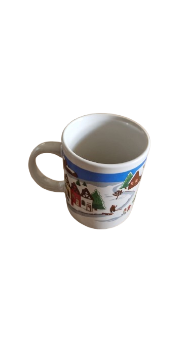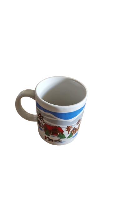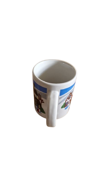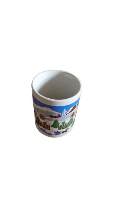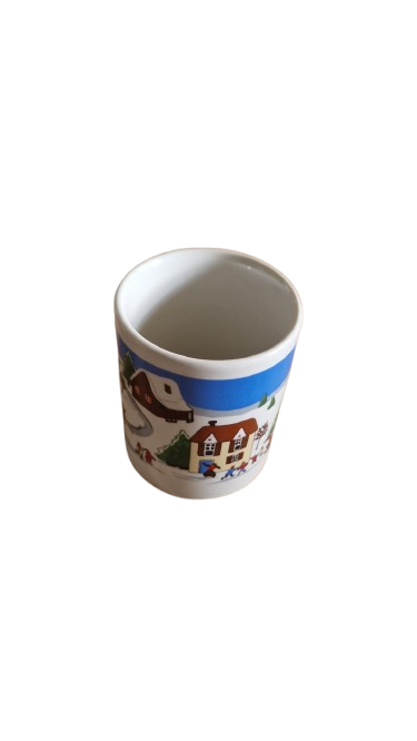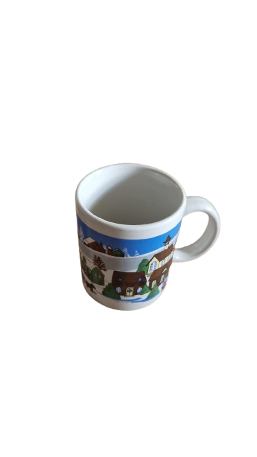 Dva porcelánové vánoční hrnky s motivem vesnice v zimě.