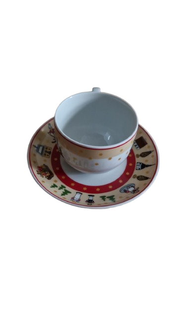 Porcelánový šálek s podšálkem zdobený vánočním motivem, značky Kahla.