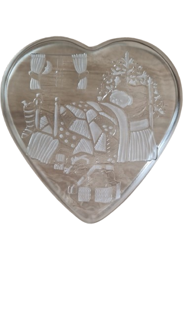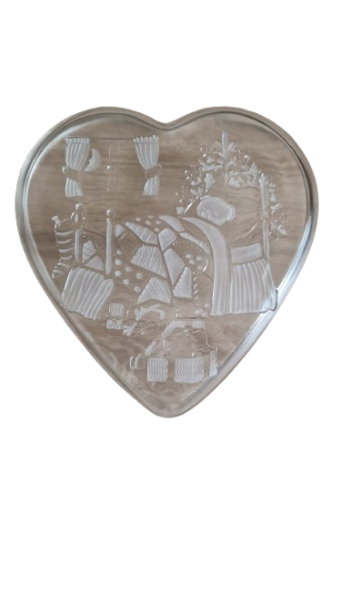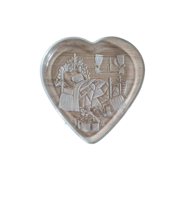 Vánoční skleněný podnos srdce vyrobený německou sklárnou "Walther Glas" s motivem spícího medvídka.