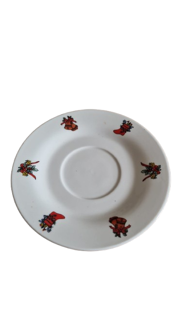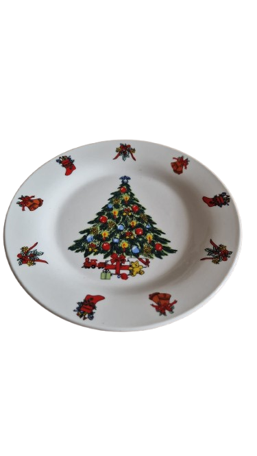Ústředním prvkem motivu je zdobený vánoční stromek se žlutou hvězdou na špici. Na talířcích jsou po obvodu rozmístěné další symboly: vánoční punčochy, zvonečky a dárky svázané červenou mašlí.