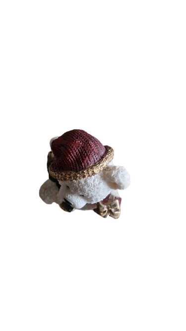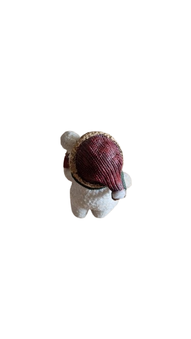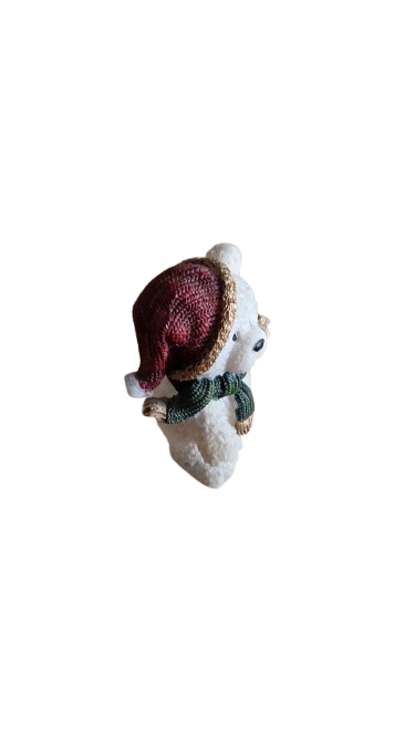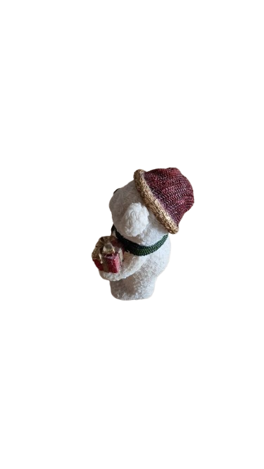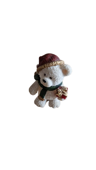 Keramická figurka vánočního medvídka s texturovaným povrchem, zdobený čepicí, šálou a dárečkem.
