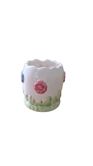 Květináč má vlnitý horní okraj a je zdoben barevnými motivy, včetně trávy a vajíčka, což podtrhuje jeho sezónní a sváteční charakter.