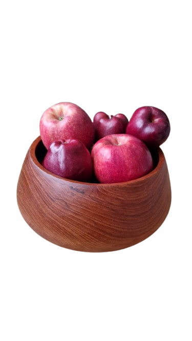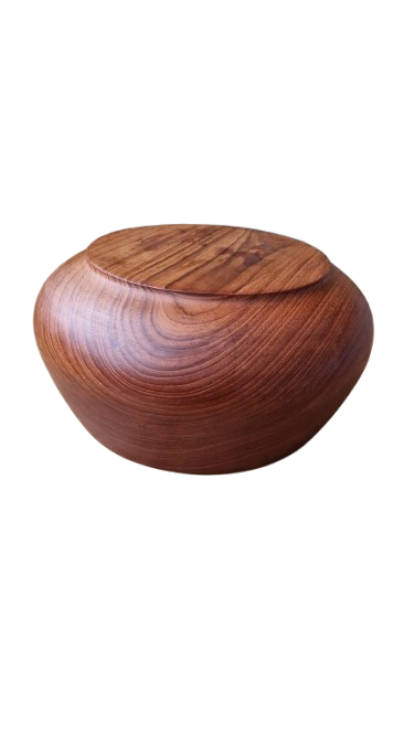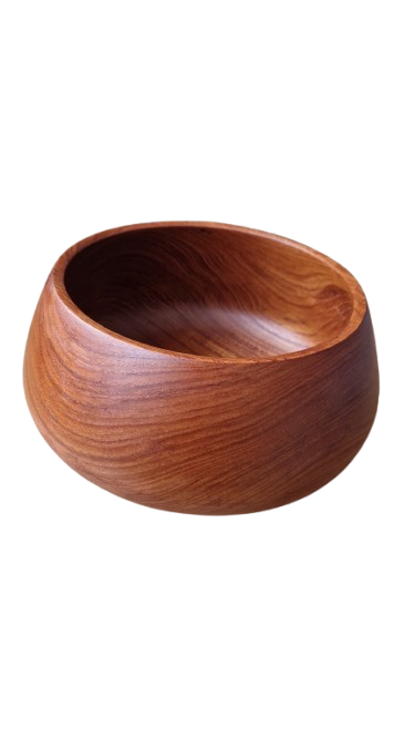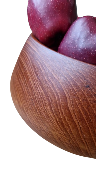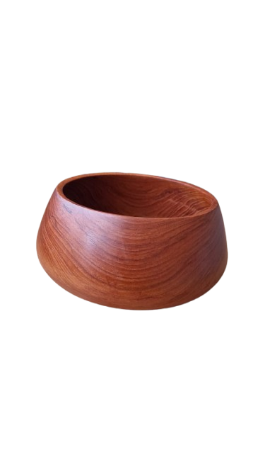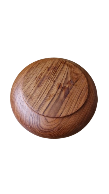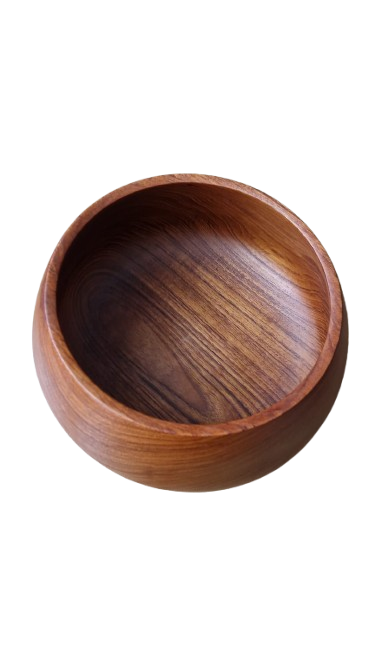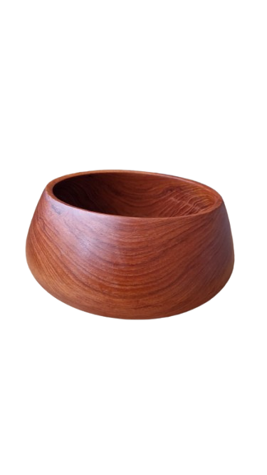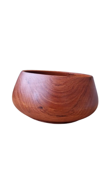 Luxusní, ručně soustružená mísa z masivního teakového dřeva v ikonickém Mid-Century moderním stylu. Mísa má nadčasový organický tvar s mírně uzavřeným horním okrajem, který je typický pro skandinávský design 60. let. Dřevo má nádhernou, sytou kresbu s medovými a načervenalými tóny.