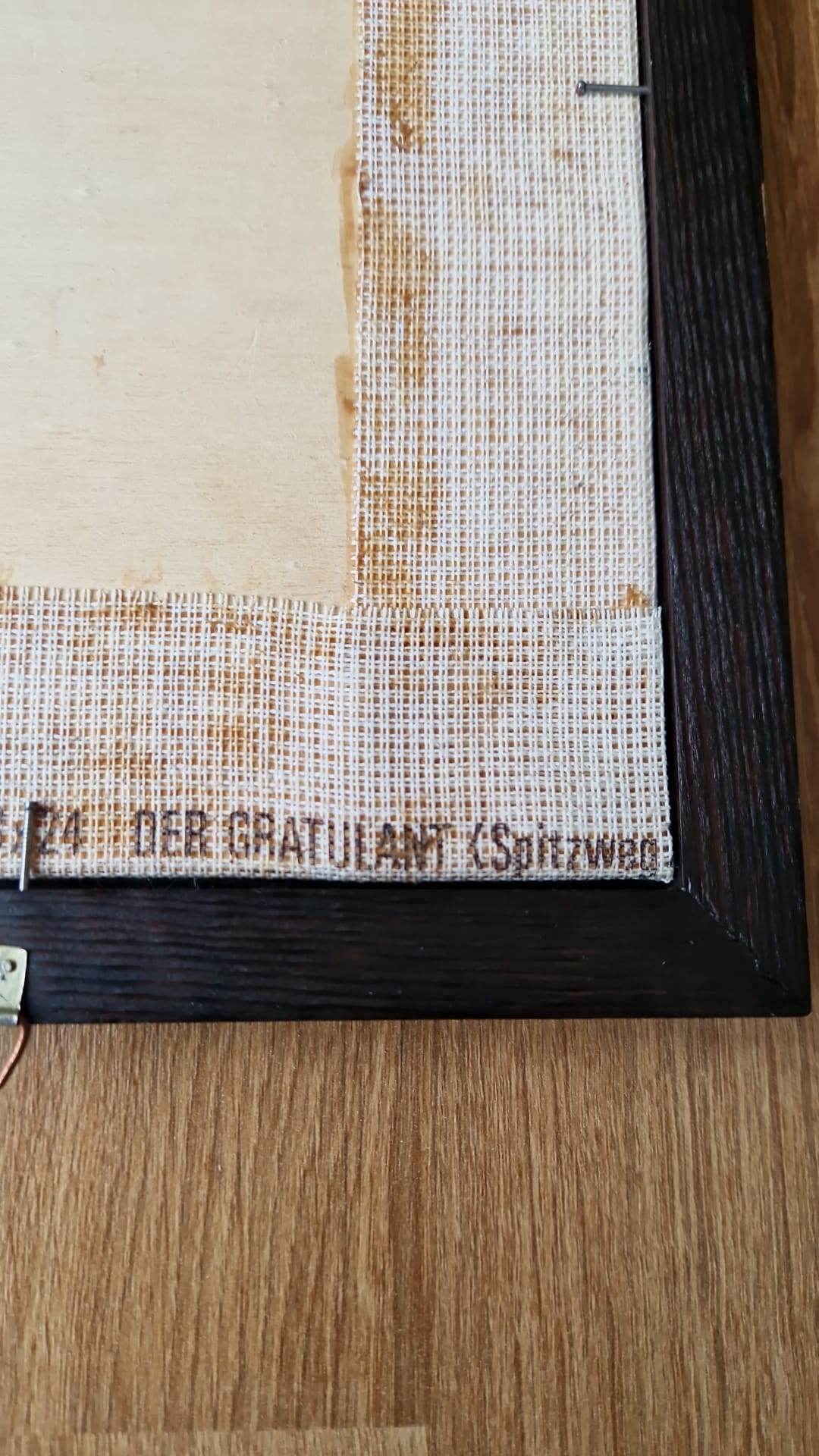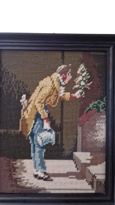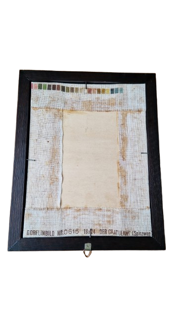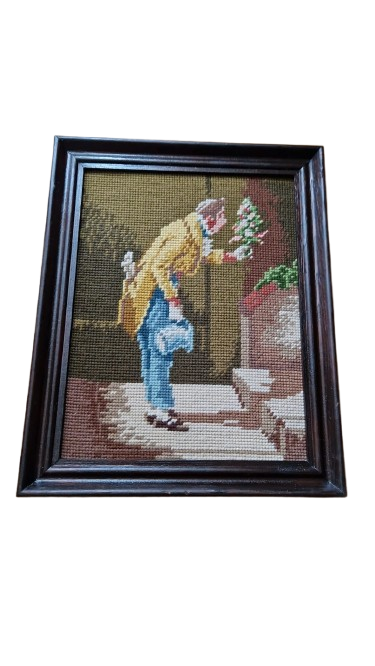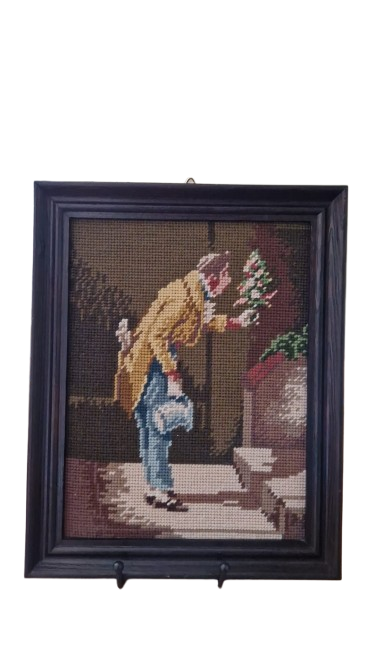 Krásně zachovalá gobelínová výšivka v dřevěném rámu ze 70. let s ikonickým námětem "Der Gratulant" (Gratulant). Autorem původní předlohy je slavný německý malíř Carl Spitzweg, mistr žánrových výjevů, jehož díla jsou symbolem poctivého biedermeieru.
