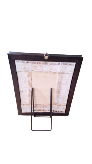 Obraz je zasazen v původním, vkusně profilovaném dřevěném rámu v tmavě hnědém odstínu. Na zadní straně se nachází originální štítek s identifikačním číslem modelu (NR. 0615) a rozměrem.