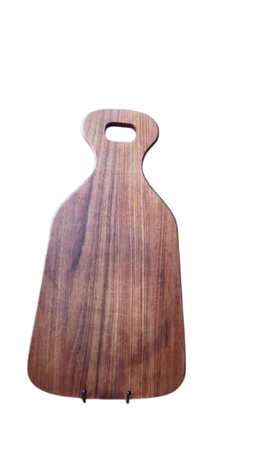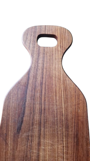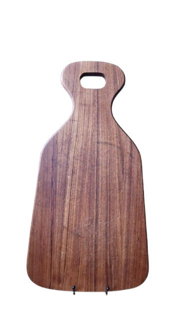 Luxusní kuchyňské prkénko vyrobené z masivního teakového dřeva. Tento kousek zaujme svou typickou bohatou a teplým medovým odstínem kresbou, který je pro starý teak charakteristický. Prkénko má elegantní organický tvar s integrovaným madlem pro snadnou manipulaci nebo zavěšení