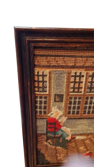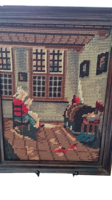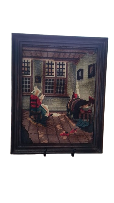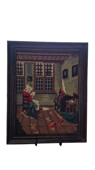 Krásný, ručně vyšívaný obraz (technika gobelínového stehu) v duchu starých holandských mistrů. Tento kousek je ukázkou precizního řemesla z 60.-70. let 20. století, kdy se vyšívání vlnou těšilo velké prestiži.
