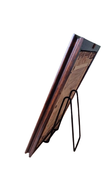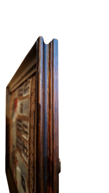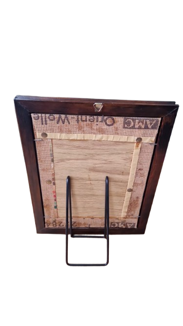 Obraz je zasazen v původním, vkusně profilovaném dřevěném rámu v hnědém odstínu.