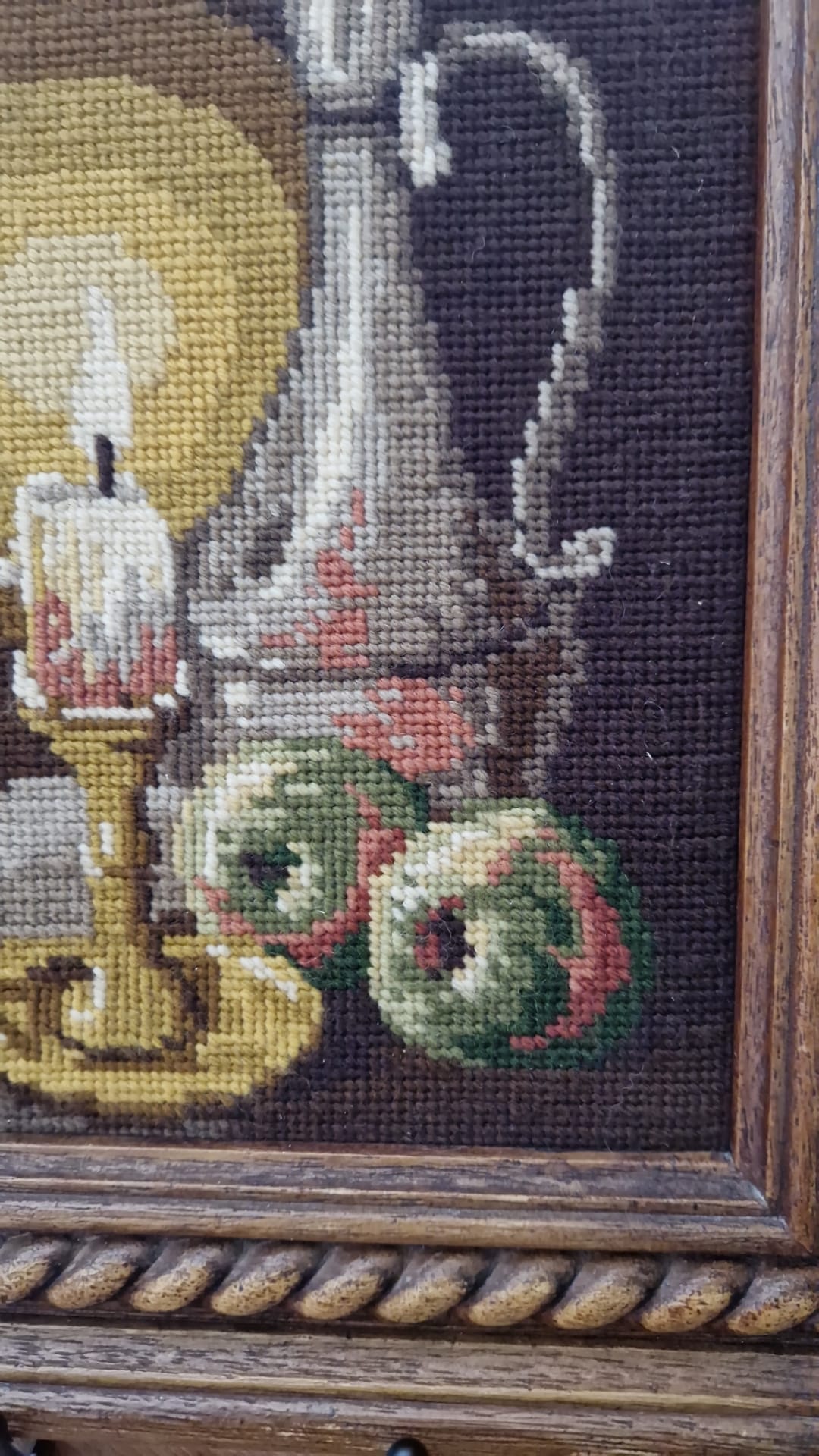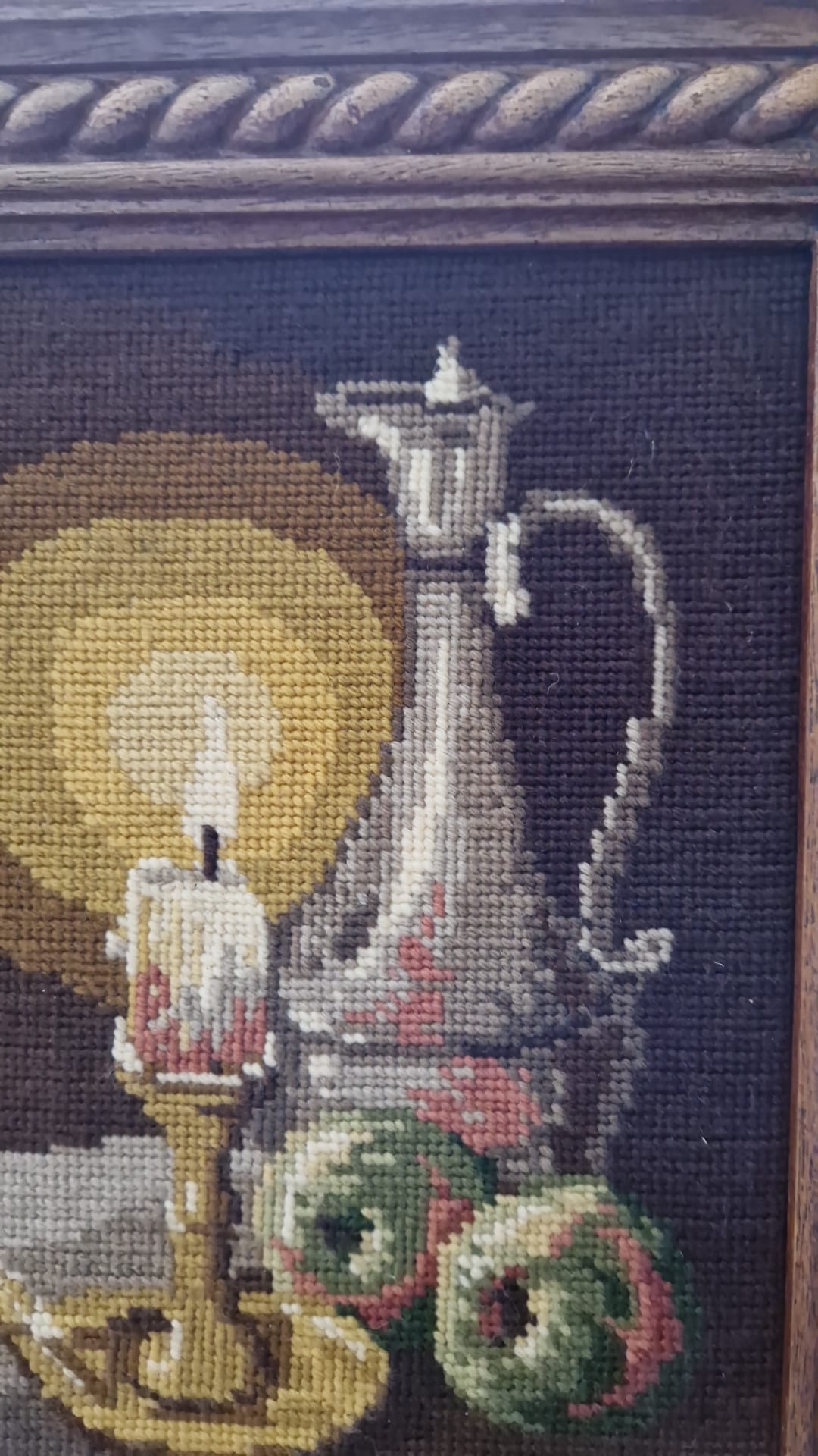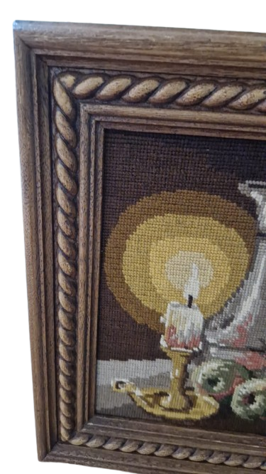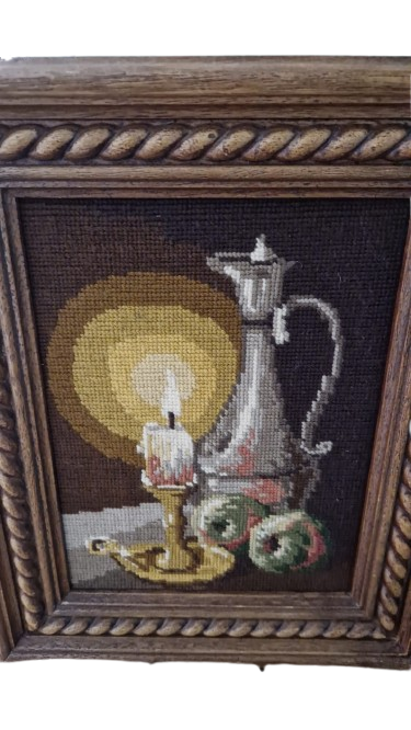 Zachovalý retro obraz ze 70. let s ruční vlněnou výšivkou na kanavě. Klasický motiv zátiší s hořící svící a konvicí v hřejivých podzimních tónech. Výšivka je precizní a barvy jsou stále syté.