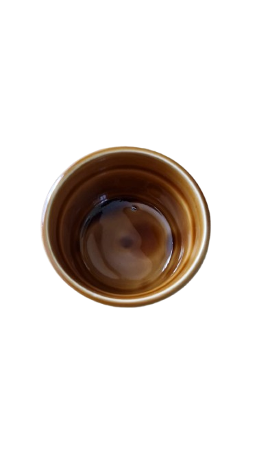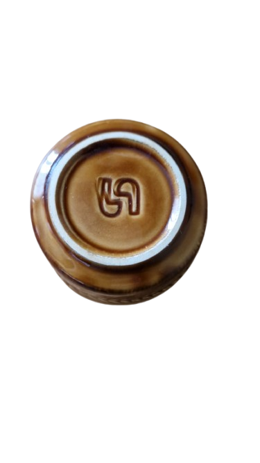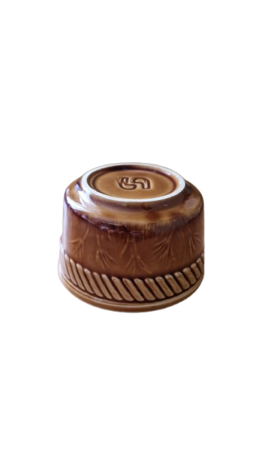 Má lesklou, karamelově hnědou glazuru zevnitř i zvenčí. Vnější strana je zdobena pleteným nebo provazovým vzorem poblíž okraje a na spodní části misky je vidět reliéfní vzor obilí.